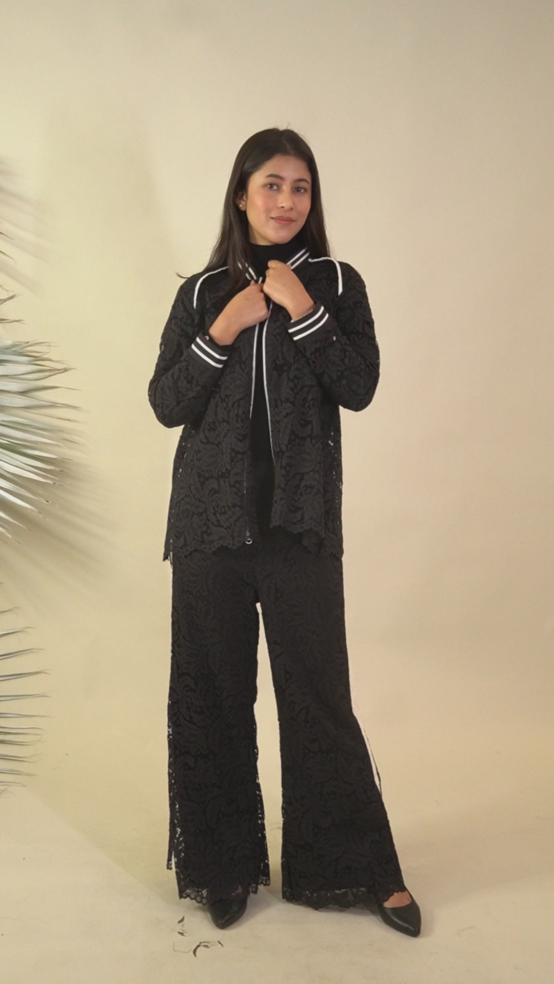 A chic black lace co-ord set designed with sporty trims and a universally flattering fit. This stylish two-piece outfit blends premium lace detailing with a modern athleisure touch, making it perfect for travel, evenings out, and statement airport looks. Ideal as a versatile black outfit for holidays, parties, and fashionable on-the-go dressing.